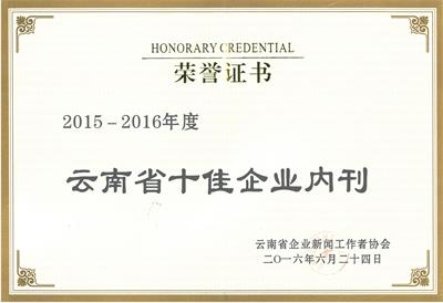 ![]() 企業(yè)內(nèi)刊《新百大》榮獲2016年度云南省十佳企業(yè)內(nèi)刊 |
